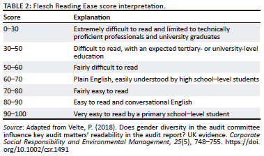 The focus was on the number of KAMs reported in total and per type, with scaling for the number of clients per audit firm where applicable. These scores were treated as being at least ordinal. To provide additional insights, the readability of the KAMs was computed. The readability scores captured reading ease determined according to the Flesch Reading Ease Level. The results were corroborated using the Flesch-Kincaid Grade scores (untabulated). Although these use the same core measures (word and sentence length), they have different weighting factors. In the Flesch Reading Ease test, a higher score or result indicates that KAM disclosures are easy to read, while a lower score represents text which is more complex and difficult to read. The Flesch-Kincaid Grade Level, used to corroborate the readability scores, represents a United States grade level score to judge the text's readability. A higher number corresponds to a higher level of education required to understand the text (Velte, 2018). The Flesch Reading Ease grading level and interpretation are presented in Table 2.