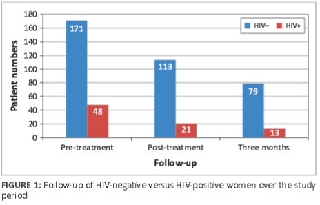Unemployed women had a statistically significantly higher HIV-positivity rate (26%) than the employed women (23%). The loss to follow-up of HIV-positive women v. HIV-negative women during the post-treatment (56% v. 34%) and 3-month (38% v. 30%) follow-up visits was statistically significantly higher for the HIV-positive women (Figure 1). Cause and confirmation of death could be accurately determined in 20 women in the total study population.