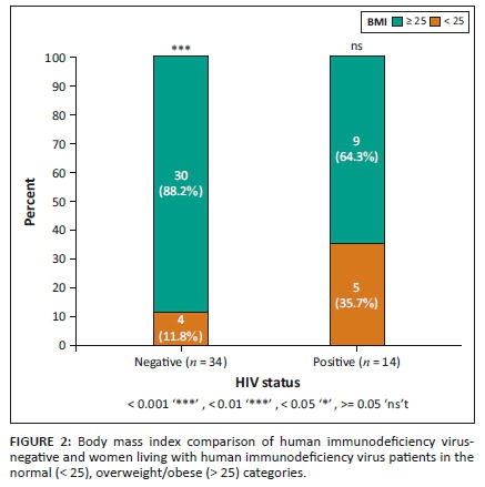 RESULTS: A total of 52 patients were assessed, 34 HIV-uninfected and 18 WLHIV. The median age of WLHIV versus the uninfected women was 35 and 50 years, respectively, (p = 0.015). A statistically significant number of uninfected women were in the overweight/obese category (BMI > 25 kg/m2) compared to the normal weight category (BMI < 25 kg/m2) (p < 0.001). The number of obese WLHIV did not reach statistical significance.