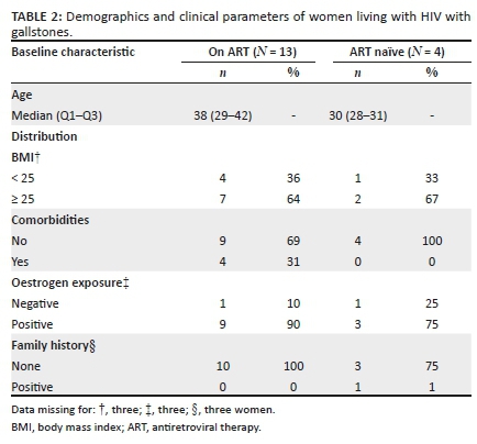 CONCLUSION: The age of occurrence of gallstone disease amongst black South African WLHIV was significantly lower and fewer women were obese compared with the uninfected women with gallstone disease. These findings differ from known gallstone risk factors in other populations and in uninfected black South African women. This could be attributed to the metabolic alterations caused by HIV infection itself and/or to the long-term use of ART. Larger cohort studies are required to elucidate the role of HIV and ART in cholestatic disease