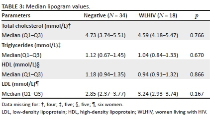 The median values of LDL were higher in the WLHIV group compared with the HIV-uninfected group; HDL levels were lower amongst WLHIV. These results did not reach statistical significance (Table 3).