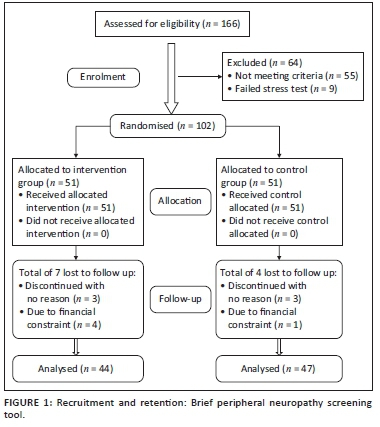The parameters to calculate sample size were set as follows: power of the study = 80%, alpha level < 0.05, groups = 2, effect size f = 0.32 (medium) and number of repeated measures = 3. A sample of 43 participants would be required in each group. The sample size of 86 was sufficient for this study; however the number of participants recruited was increased to 166 to accommodate the expected attrition. The participants were divided into two groups: PRE group and a control group (CG). An independent physiotherapist conducted randomisation using a computer random number allocation sequence. Based on the initial assessment, 55 participants were disqualified during the initial examination because of the absence of signs or symptoms of neuropathy and nine participants failed the stress tests, leaving 102 participants for randomisation into exercise and CGs. Ninety-one participants completed the study as shown in the consort flowchart of the study (Figure 1).