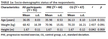 The age range of the participants was 20-55 years. The mean (± standard deviation [± s.d.]) age of the experimental and CG were 35.98 (± 8.53) and 36.13 (± 8.10) years, respectively. The socio-demographic and basic health status characteristics of the participants were similar in all baseline measures between the groups (Table 1a and 1b). Seven (6.9%) of the 51 participants randomised to the PRE group dropped out, whilst four (3.9%) of the 51 randomised to the CG dropped out (Figure 1). Exercise subjects who did not drop out had excellent adherence attending 95% of scheduled exercise sessions.