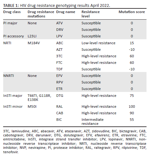 Due to poor adherence and patient not suppressing for two years on the DTG-based regimen, despite enhanced adherence counselling, HIV DR was done in April 2022 which showed M184V again and the development of InSTI mutations (major T66TI, G118R, E138K, minor M50I), conferring high-level resistance to DTG (refer to Table 1).