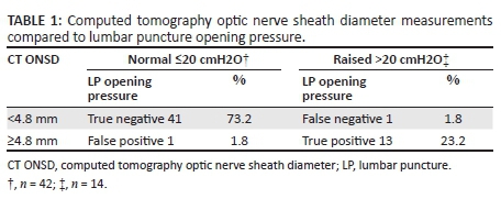 METHOD: We conducted a cross-sectional, retrospective analysis of anonymised patient data, comparing the ONSD on CT imaging with the opening pressure manometry during LP on patients who presented with focal neurology or with a Glasgow coma scale score of less than 15. The study sample consisted of 67 patients, ≥18 years of age, treated at the emergency department of the Kimberly Hospital Complex from 01 March 2013 to 31 December 2014.