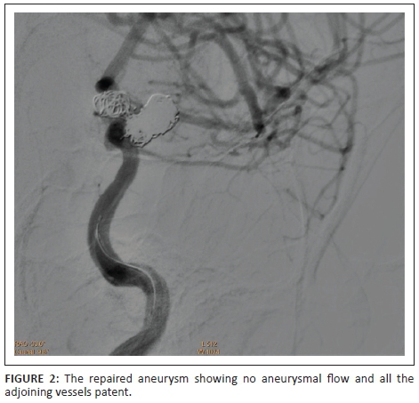 A 36-year-old female patient, who was 20 weeks pregnant, was referred to the Universitas Academic Hospital in Bloemfontein, with a suspected left internal carotid artery (ICA) aneurysm. She presented with a chronic headache and dysphasia. Magnetic resonance imaging (MRI) was performed, showing a left ICA aneurysm and infarction, which was possibly related to emboli from the aneurysm. The patient was counselled regarding treatment options. The possible adverse effects of the radiation on her baby, and their mitigation, were explained. A four-vessel cerebral angiogram was performed on the patient, and a left paraclinoid aneurysm, which appeared to be superiorly projecting, was demonstrated (Figure 1).