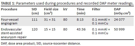 DAP meters are widely used in interventional X-ray units, however, the radiation hazard cannot readily be obtained from the DAP value. Kisielewicz et al. formulated a relationship to estimate the patient entrance surface dose (ESD) from the DAP values.2 This relationship, however, can only be used as a guideline because the parameters used in this case and that used by Kisielewicz et al. differ to some extent. Using this relationship, the patient ESD, after the four-vessel angiogram, was 100.82 mGy and for the endovascular stent-assisted aneurysm repair was 826.45 mGy, which was found to be 23.67% of the diagnostic reference level (DRL) used in our Department.