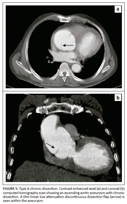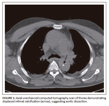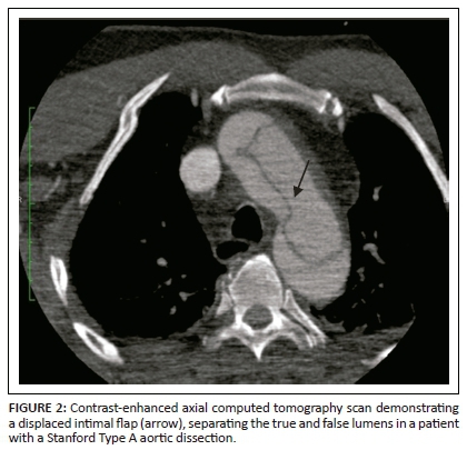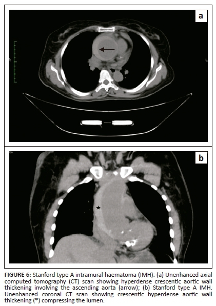 Intramural haematoma is the aortic wall thickening, caused by acute haemorrhage contained within the media. It was widely believed that it occurs owing to spontaneous rupture of the vasa vasorum with an intact intima. However, with recent advances in imaging, intimo-medial tears have been detected, suggesting that IMH has one entry tear with no exit, whereas AD has entry and exit intimo-medial tears into the aortic lumen. Intramural haematoma constitutes 5% - 15% of all cases of AAS.10 Acute chest pain is the most common presenting symptom. Non-enhanced CT is very important in diagnosing IMH.