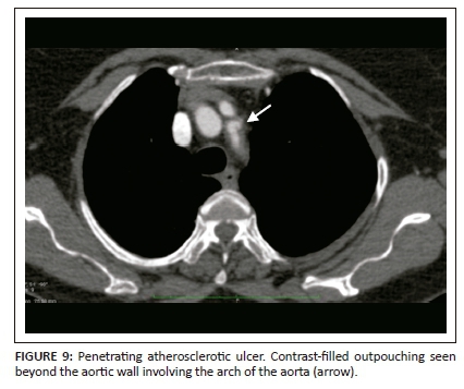 Extensive intimal calcifications are the frequent finding on unenhanced CT. A contrast-filled outpouching extending beyond the aortic wall is diagnostic of PAU (Figure 9). Hyperdense haematoma adjacent to the ulceration may be seen on unenhanced CT.14 The lesions can be single or multiple. Adjacent aortic wall thickening with atheromatous plaques are often seen. Penetrating atherosclerotic ulcer can progress to form a saccular aneurysm or even rarely, rupture. Additional imaging findings like haemothorax, haemopericardium, mediastinal haematoma, AD and ischemic findings owing to vascular obstructions can be seen as complications of PAU (Figure 10).