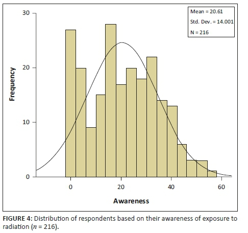 Nearly all the medical doctors in this study (98.10%) demonstrated poor awareness of radiation risks, and only 1.40% expressed fair awareness, while none showed good awareness (Figure 3). The scoring of doctors' awareness of radiation risk was normally distributed with mean and standard deviation value of 20.16 ± 14.0 (Figure 4).