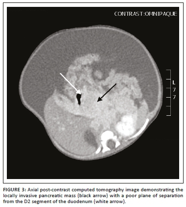 This was followed by a computed tomography (CT) scan of the abdomen and pelvis with an intravenous and oral contrast agent. Computed tomography imaging showed an ill-defined, enhancing mass in the head of the pancreas (Figures 1-3), with a poor plane of separation from the D2 segment of the duodenum (Figures 1 and 3). Enhancing soft tissue, which extended beyond the confines of the pancreatic head into the region of the porta hepatis, was also noted and appeared to be contiguous with this mass (Figure 1).