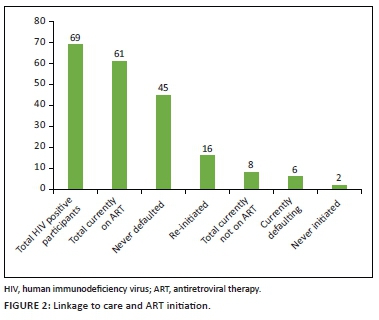 Of the 69 participants who were HIV positive, the majority (n = 61; 88.4%) were on ART at the time of the study. Of those on ART, 16 (26.0%) participants had a history of non-adherence to ART and were re-initiated at the local clinic (before the study). Six (8.7%) participants admitted to not taking ART daily in the week before the study. Eight (11.6%) participants were not on ART at the time of the study, six (8.7%) of them were non-adherent to g ART at the time of the study and two (2.9%) were never initiated. All the eight participants who were not on ART at the time of the study were referred for initiation (Figure 2).