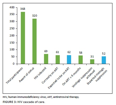 Figure 3 provides a graphic summary of the cascade of care for HIV in this cohort and the drop-off (blue bars) at each stage of the cascade. In keeping with the Joint United Nations Programme on HIV/AIDS (UNAIDS) 90:90:90 target, 62 (90%) participants are expected to have been on ART and not 61, as there are 69 HIV positive participants. Also, 52 (90%) of the 58 HIV positive participants on more than 6 months of ART should have attained virologic suppression, and not the low number of 31 (53.4%) participants.