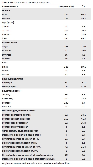 Of the total participants (n = 368), the male to female distribution (50.8% versus 49.2%) was roughly equal. The highest proportion of the participants were at least 50 years old (n = 144; 39.1%). The majority of the participants were single (72.0%), black people (89.1%), had attained primary education (63.0%), and were unemployed (91.0%). Most of the participants (n = 272, 73.9%) were diagnosed with a primary psychiatric disorder, while 34 (9.2%) participants were diagnosed with a psychiatric disorder secondary to HIV infection. A total of 43 participants had a psychiatric disorder secondary to AMC (such as epilepsy), and 19 participants (5.2%) had psychiatric disorder because of substance abuse (Table 1).
