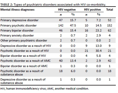 Of the 69 participants with comorbid diagnosis of HIV and psychiatric disorder, primary psychiatric disorders accounted for 47.8% (n = 33), psychiatric disorders secondary to HIV accounted for 49.3% (n = 34) and psychiatric disorders because of AMC accounted for the remaining 2.9% (n = 2) (Table 2).