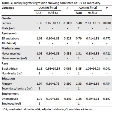 In the bivariate analysis, the female gender was significantly associated with concurrent HIV and psychiatric disorder. Although the co-occurrence of HIV and psychiatric disorder was highest among the participants who were single, black, had primary education, and were unemployed, this association was not statistically significant (Table 3).