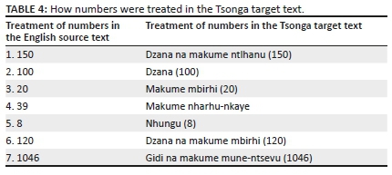 When it comes to the treatment of numbers in the text, the Tsonga direct equivalent is given in letters and the numeric is placed in brackets (Table 4). This is performed because the translator tries to move towards the Tsonga literary culture, which promotes and allows the use of numbers in its literature. Nonetheless, the shift made here is non-obligatory as anyone who can read and write Tsonga is able to understand the numeric form.