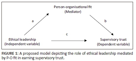 The second research objective relating to the literature review focused on the relationship between the antecedent of ethical leadership and the outcome of supervisory trust, and how this relationship is mediated by P-O fit. Research indicates that ethical leadership significantly impacts on both supervisory trust and P-O fit; however, the possible mediating effect of P-O fit on the relationship between supervisory trust and ethical leadership does not seem to be well researched. Some of the important work that are based on the proposed theoretical model (see Figure 1) will be discussed next.