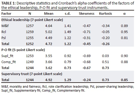 The descriptive statistics in Table 1 show that the skewness and kurtosis values of the factors do not exceed the critical values of 2.00 and 7.00 respectively, which is an indication that the data are normally distributed. The majority of the values of the ethical leadership, P-O fit and supervisory trust constructs and sub-factors on the skewness scale were negative, which is an indication that the distribution has relatively few small values and tails off to the left. The Cronbach's alpha coefficients of the factors are acceptable if the guideline of α > 0.70 is applied. It would thus appear that the factors possess acceptable levels of internal consistency, providing some evidence that the items measure the same general construct, which assures the overall reliability of the instruments.