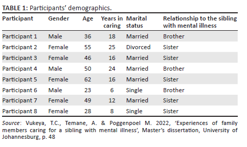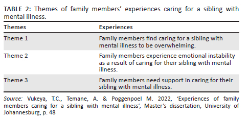 Vukeya, T.C., Temane, A. & Poggenpoel M. 2022, 'Experiences of family members caring for a sibling with mental illness', Master's dissertation, University of Johannesburg, p. 48. [ Links ]