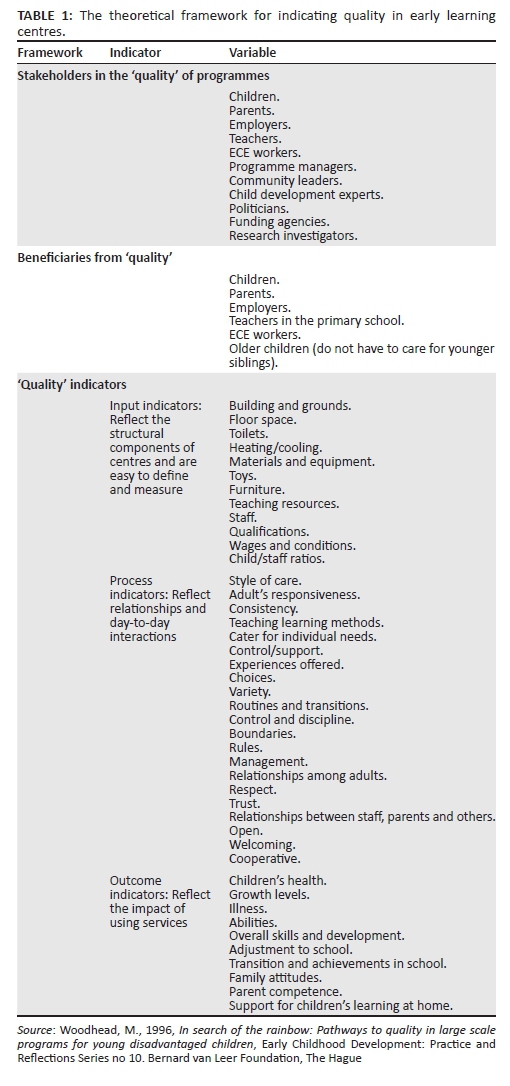 In the next section, the contextual background of quality in early childhood education in South Africa is addressed and the theoretical framework used in the study is explained.