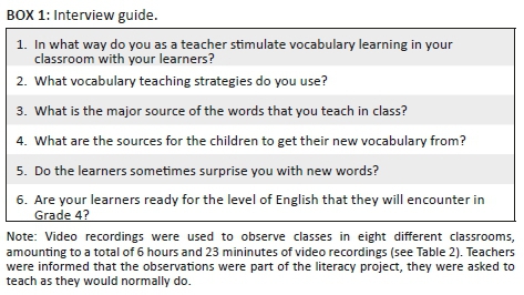 A semi-structured interview approach (Bryman 2004) was used based on an interview guide with six questions (see Box 1). The first two questions addressed vocabulary learning and the use of teaching strategies in the classroom. To provide a clearer picture of the teaching context, questions 3 and 4 addressed the vocabulary sources available at school and at home. To get a better understanding of the teachers' estimation of the vocabulary level of their students, questions 5 and 6 targeted learners' vocabulary levels. Participation was voluntary and unpaid. All teachers gave permission for the recording of the interviews.