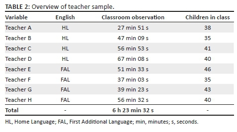 Convenience sampling was applied in the selection of the teachers. Eight female Grade 3 teachers volunteered to participate in the study, two from each school. All teachers were observed while teaching and seven teachers were interviewed: three from the Eastern Cape and four from the Western Cape. One teacher was unavailable to be interviewed because of illness.