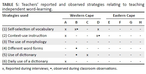 Only the Western Cape teachers used some of the independent word-learning strategies (see Table 5). Three teachers reported stimulating students to bring new words into their classrooms, two reported teaching their learners about context-use and one teacher reported using dictionaries on a daily basis. Only two teachers were observed using independent word-learning strategies in practice.