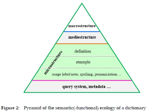 First and foremost, the complicated semantic system of a dictionary is comparable to an ecology where meaning is like energy. Meaning flows and expands (Liu 2017), just as energy flows and circulates. As an ecological system, an e-dictionary is even more open and dynamic than a paper dictionary. There are interactions among the diverse members in this ecology, including cooperation and competition. Its components or communities are conceptually linked together as an integrated whole in a hierarchy. This organic whole is served by the dictionary macrostructure, mediostructure and microstructure as well as other information components that are themselves reciprocally conditioned. The macrostructure is the form and size of a dictionary, the medio-structure refers to its system of cross-referencing which can create textual cohesion, and the microstructure means its lexical entries or articles. Figure 2 roughly illustrates a pyramid of the dictionary semantic(-functional) ecology.