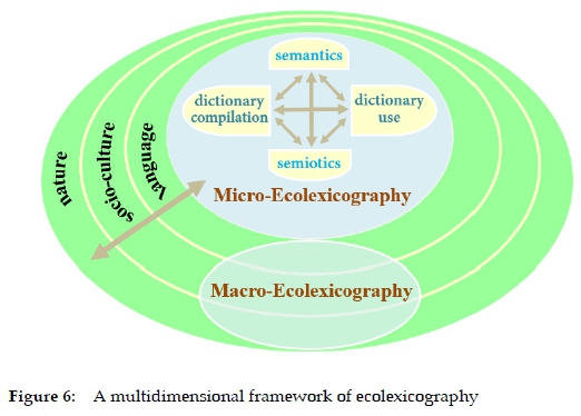 Another illuminating insight that ecolexicography can gain from ecolinguistics contributes to an upgraded understanding of its overall framework. Steffensen and Fill (2014) point out four ways the language ecology has been conceptualized as a symbolic ecology, a cognitive ecology, a natural ecology, and a sociocultural ecology. Similarly, in terms of ecolexicography, a symbolic ecology can be understood as the semantic and semiotic ecology in a dictionary. A cognitive ecology of lexicography involves dictionary compilation/ design as dialogism and dictionary use as distributed cognition. The two constitute the microlevel of ecolexicography. At the macrolevel, ecolexicography should be committed to serving the linguistic, natural and sociocultural ecologies. The differentiation (and complementarity) between the microlevel and the macrolevel of ecolexicography mirrors the exoecological vs. endoecological division in ecolinguistics.