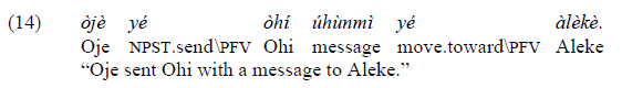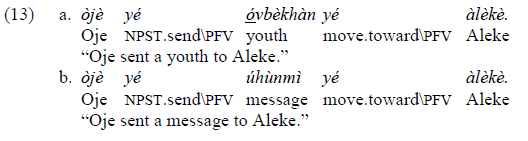Verb ye 'send,' which is a primary verb of Class A, manifests an unusual property in some SVCs of information exchange. In a simple clause ye 'send' is transitive and takes a human noun direct object (ye óvbèkhan 'send a youth'), not a message nominal (*ye uhùnmi 'send a message'). The verb ye 'send' also occurs as a ditransitive with two following arguments (ôjè yé ôhi uhùnmì 'Oje sent Ohi on an errand / with a message'). Rather unusual for Emai ditransitives, ye and its two arguments can occupy the V1 slot in A-SVCs while ye 'move toward' in its allative function fills the V2 slot (14).