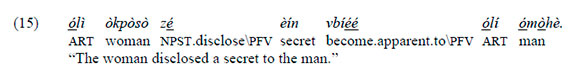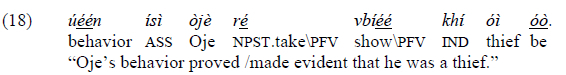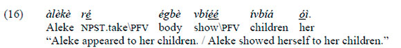 In A-SVCs vbiee displays meanings related to events of direct causation. Verb vbiee occurs as major component in slot V2. In slot V1 we find the minor component re 'take.' Its direct object is here limited to the body-part nominal égbè 'body.' SVC meaning relates to causing the body to become apparent or visible to someone.