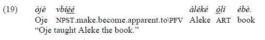 In a simple clause vbiee appears as a ditransitive verb with meanings related to making something apparent or teaching something to someone. Compared to ye and its ditransitive shape, vbiee ditransitives and their double object complement do not participate in serial constructions.