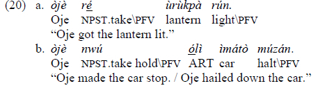 Some Emai verbs reflect secondary concepts of the SEC-C-1 MAKING class. They appear in A-SVCs. As a minor component in slot V1, we find a class of verbs that express the handling of physical objects. They include re 'take' and nwu in its 'take hold' sense (ôjè nwú ákpózeva [Oje NPST\take.hold\ PFV second.position] 'Oje took second position / Oje came in second'). The major V2 slot is occupied by a verb in simple clauses that conveys change of state (óll ùrùkpà rún-l [the lantern PRP.light-PFV] 'The lantern got lit / is lit' and óli imáto múzán-i [the car halt-PFV] 'The car halted'). SVCs of this type show the subject argument as direct cause of the associated change of state. They can also exhibit a switch function relation given that the direct object of V1 serves as the logical subject of V2 (20b).