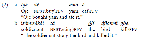 A second S-SVC type reflects a temporal relation of sequence between verb events. Order of the two verbs in sequence is iconic with respect to pragmatic real-world conditions. The verbs share subject and direct object arguments (1). Both construction slots in the SVC filled with verbs from large open classes. In a simple clause each component verb occurs as a transitive form de émà 'buy yam,' e émà 'eat yam,' sa áfiánmi 'sting bird,' gbe afianml 'kill bird.'