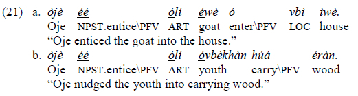 Verbs not participating in Emai SVCs also reflect Dixon's SEC-C-1 MAKING class. They include form ze with meanings 'cause' and 'allow.' It takes either a clausal complement or a truncated clause as subjunctive complement, both leading to biclausal constructions.