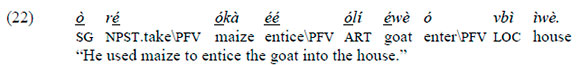 An A-SVC consisting of minor verb ee and major verb o 'enter' together can occupy the V2 slot in a serial-within-serial structure that is itself an A-SVC. Slot nesting of this type, illustrated in (22), shows verb re 'take' as minor component in the V1 slot. It adds a non-core argument to the enticing event.