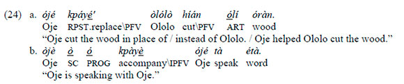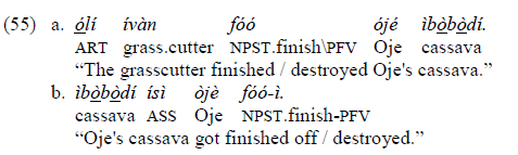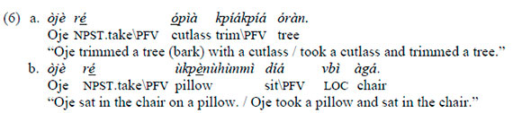 Another A-SVC of the valency increasing type specifies an instrument or means for the action of a major component verb in V2 position. V1 re 'take' serves as a minor component. Major component verbs include kpiakpia óran 'trim a tree' or dia vbi àga 'sit in a chair.' A switch function relation among construction arguments appears to vary according to whether re direct object serves as event instrument or means, since cutlass in (1a) directly causes the tree to be trimmed but pillow in (1b) does not directly cause the chair to be sat in. Rather, the pillow allowed the chair to be sat in.