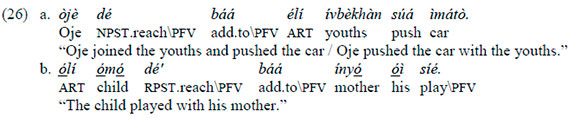 Both de and baa occur as verbs in a non-SVC clause. Form baa occurs in a postverbal particle construction with change of location particle o (33). It does not occur in a simple monotransitive clause. Verb de as a transitive has the sense 'reach' a location on the horizontal plane (de áfúzé' 'reach Afuze'), while intransitive de expresses the sense 'fall' (ôjè gbó dé 'Oje also fell').