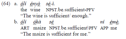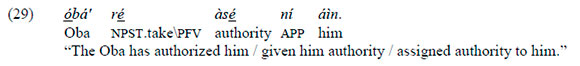 An additional Emai form associated with the MAKING class is àsé. It is a noun meaning authority. It occurs in simple clauses as direct object of a transitive verb (moe àsé 'have authority'). It also occurs as direct object in postverbal particle predicates with applicative li/ni. However, àsé is not found as direct object in a SVC.