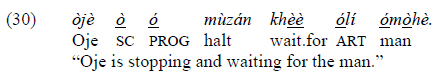 Several Emai verbs display meanings related to the SEC-B-2 POSTPONING class. They occur in A-SVCs. The verb khee 'wait' appears as the minor component in the V2 slot. As the major component in the V1 slot, verb muzan 'halt' occurs.