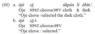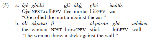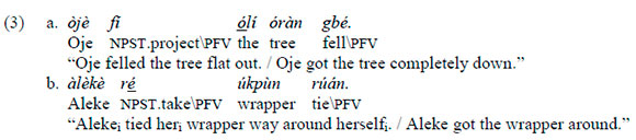 S-SVCs of a resultative subtype have unrestricted, open class transitive verbs in V1 and V2 slots. In combination they articulate repositioning an entity to a maximum extent. V1 is filled by a verb of handling ('carry', 'throw', 'take') that expresses a causative function relative to its immediately following nominal, which is displaced to a maximum extent. However, V1 does not take the displaced nominal as a subcategorized direct object in a simple clause (*f óran 'project/throw a tree', *re úkpun 'take a wrapper'). In contrast, V2 as monotransitive in a simple clause does (gbe óran 'fell a tree' and ruan ukpùn 'tie a wrapper').