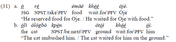 Verb khee also occurs as major component in the V2 slot of an A-SVC. Its minor component in the V1 slot consists of verbs that add non-core arguments such as re 'take' and kpen 'be next to.' In a simple clause, khee occurs as transitive and displays meanings related to waiting (khee ikôikô 'wait for gorilla') and guarding (khee iwè 'guard house').