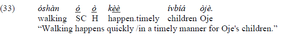 Overall, our review indicates that secondary concepts only partially align with Emai verbs in SVCs. A significant number of synchronic preverbs realize secondary concepts of the SEC-A class and have a verb heritage. They have grammaticalized, as judged by their syntactic and tonal behavior, from diachronically earlier verb-in-series structures. They are no longer marked by the high or low tone spread of perfective and imperfective aspect. They show a tonal melody that is defined by contour tonal structure, in contrast to non-contour, level tone of the verb proper. It seems reasonable to hypothesize that pre-stem position vis-à-vis a canonical monotransitive verb has had a privileged role in the evolution of preverbs expressing secondary concepts from SVCs. It also appears that this privileged role has continued to affect the course of serialization for event and participant qualifiers. Postverbal particles, on the other hand, are synchronically less distinct from their verb sources since they exhibit a fixed rather than variable tone for instance. An even less distinct coding relation obtains between valency changing forms and their potential identification as prepositions. If such a historical scenario were the case, one might hypothesize that the diachronic trajectory of SVCs would be constrained by word class: beginning with preverbs and continuing through postverbal particles and then prepositions. For now, however, this historical trajectory remains highly speculative.