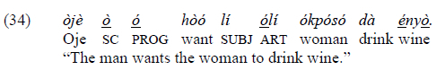 One Emai verb associated with the SEC-B-1 WANTING class is hoo 'want.' It takes a complement clause marked as subjunctive by li and the initial low tone of complement verb phrase. Verb hoo disallows a noun phrase as complement.