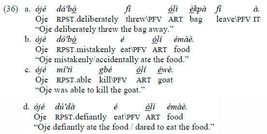 Another Emai form related to the WANTING class is ikà. A noun, it occurs in SVCs and non-SVCs. With meaning 'pretense,' ikà occurs as direct object in a simple clause (ze ikà [select pretense] 'pretend'). It also appears as direct object of verb re 'take,' which serves as minor component in the V1 slot of an A-SVC (35). In the V2 slot, the major component can be ditransitive (fi 'hit someone with something') or intransitive. When intransitive, the V2 slot itself may consist of an SVC. For instance, u 'die' as major component in an A-SVC accepts minor component fee ghoo [attenuate look] 'feign,' as in (ójé ló ù féé ghôô [Oje RFUT die\PFV Attenuate.look] 'Oje will feign death'). Since V2 here is itself an A-SVC, the V2 slot with V1 re manifests a serial-within-serial construction.