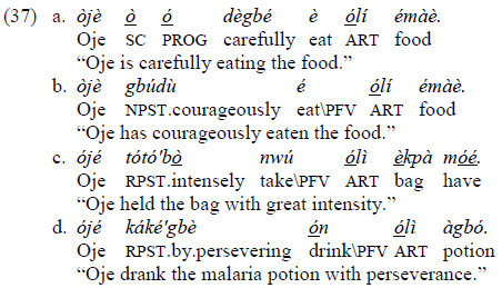 Verb-noun collocational phrases that relate diachronically to these preverbs include the following: dègbè 'carefully' from dee égbè 'lower body, duck down;' gbùdù 'courageously' from gbe ùdù 'spread heart;' tôtobô 'intensely' from toto óbo 'strengthen hand;' and kàkégbè 'perseveringly' from kaka égbè 'stiffen body.' As with intention bearing preverbs, attitudinal collocations still occur synchronically in figurative expressions.