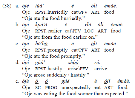 Each temporal preverb occurs as a prosodic word unit. Some derive from a verb-noun collocation (kpàô 'earlier' from kpen àó 'next to front;' bôbô 'promptly' from bi óbô 'move hand aside'), while others derive from a verb (tùà 'hurriedly' from tua 'hurry'), or relate to a synchronic adverb presumably derived from a verb (gùè 'unexpectedly' from base morpheme gùè in gùèké 'suddenly;' and gùà 'suddenly' from base morpheme gùà in gùàghó 'jerky fashion' and gúáhí 'lerching fashion'). In the adverb cases, verbal lineage is less transparent synchronically, although more extensive investigation of adverbial forms should prove illuminating.