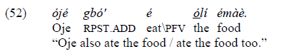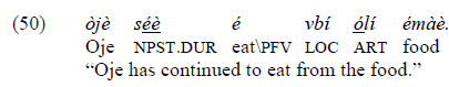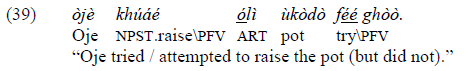 Secondary concepts that appear related to the SEC-4 TRYING class exhibit concurrent grammatical standing as postverbal particle and verb-verb sequence. Over time, one can assume that the bi-verbal sequence of some particles will lexicalize further through a process of univerbation. Each verb-verb unit appears as a configuration of major and minor components in an A-SVC. As postverbal forms they occupy the same position as particles that mark either an event argument (recipient/benefactive li/ni, locative goal o) or event aspectual relation. The canonical example of the latter is temporal and its iambitive function (ôjè é ólí émàè léé [Oje NPST.eat\PFV ART food TEMP] 'Oje has already eaten the food' and ôjè ô ó è ólí émáé lèé [Oje 3PSC PROG eat the food TEMP] 'Oje is already eating the food'). Aspectual forms in postverbal position that attend to event onset, termination, or both, as does, bear a semantic relation to the SEC-A-3 PHASAL class but not a syntactic relation, since phasal forms are limited to pre-predicate position.