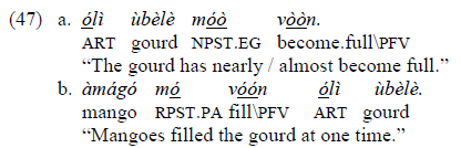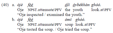 Within the structure of fee ghoo is major component ghoo. Synchronically, ghoo serves as a transitive verb of perception and attention (ghoo ôkpôsô 'look at woman'). As for minor component fee, it displays meanings related to attenuation or weakening the condition of a nominal or the relation between nominals. It no longer functions as a synchronic verb. Rather, the form fee or its presumed historical antecedent fele) is synchronically restricted to qualifier functions in positions that are adjectival (éráín féé 'fire (that) weak;' úkpún li féléfélé 'cloth which very fine;' u féléfélé 'be very fine') or adverbial (féléfélé 'very, very close'). The combined meaning offee and ghoo manifest a resultative character in which the perceptual event of V2 is engaged to a minimal rather than maximal extent. Recall that in §2 we identified resultatives of maximal extent.